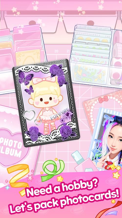 Outside of the shop, it's clear that both photocard packing mode and doll care mode are built as side activities rather than equal pillars. Packing photocards lets you select a card, slide it into a sleeve, add tapes and stickers, and arrange everything in a layout that feels like something you'd show on social media. Doll care mode has you feed a small doll, cook simple food for her, bathe her in bubbles, and tuck her into bed. Both share the same gentle ASMR approach - plastic rustles, water sounds, quiet taps - but are thin on goals. As you go, you unlock more decorative options and food items, but there's no challenge or failure, and none of your choices have an impact on the malatang shop or broader progression.